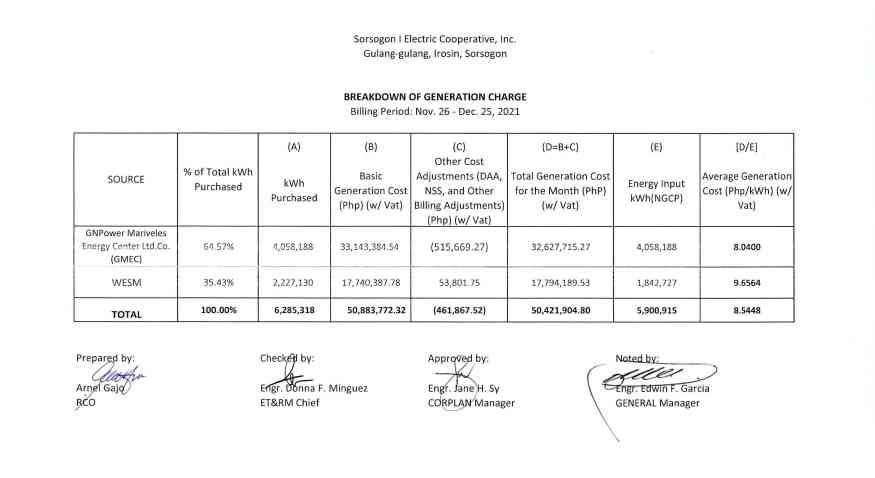 BREAKDOWN OF GENERATION CHARGE (NOVEMBER 26 – DECEMBER 25, 2021)