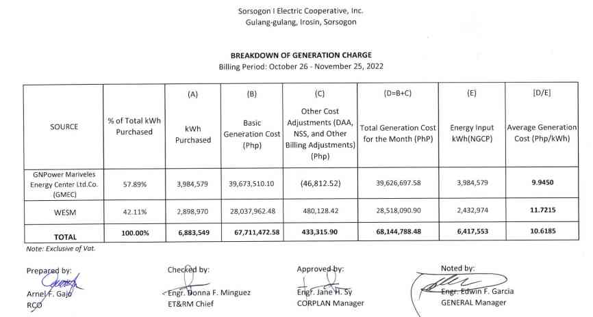 BREAKDOWN OF GENERATION CHARGE (OCTOBER 26 – NOVEMBER 25, 2022)