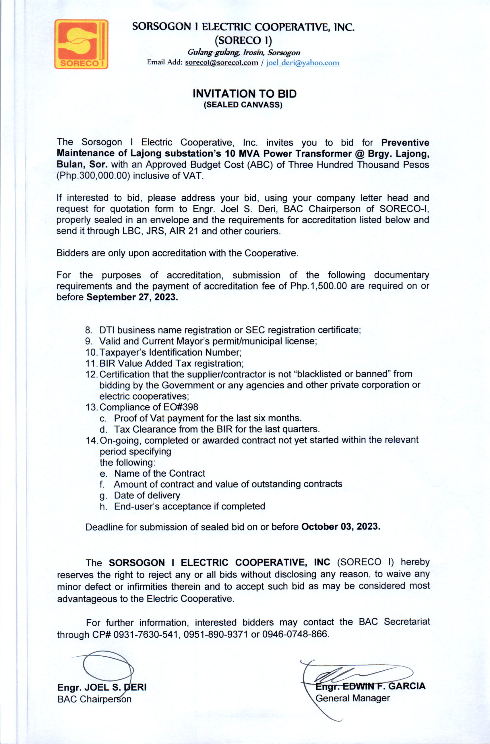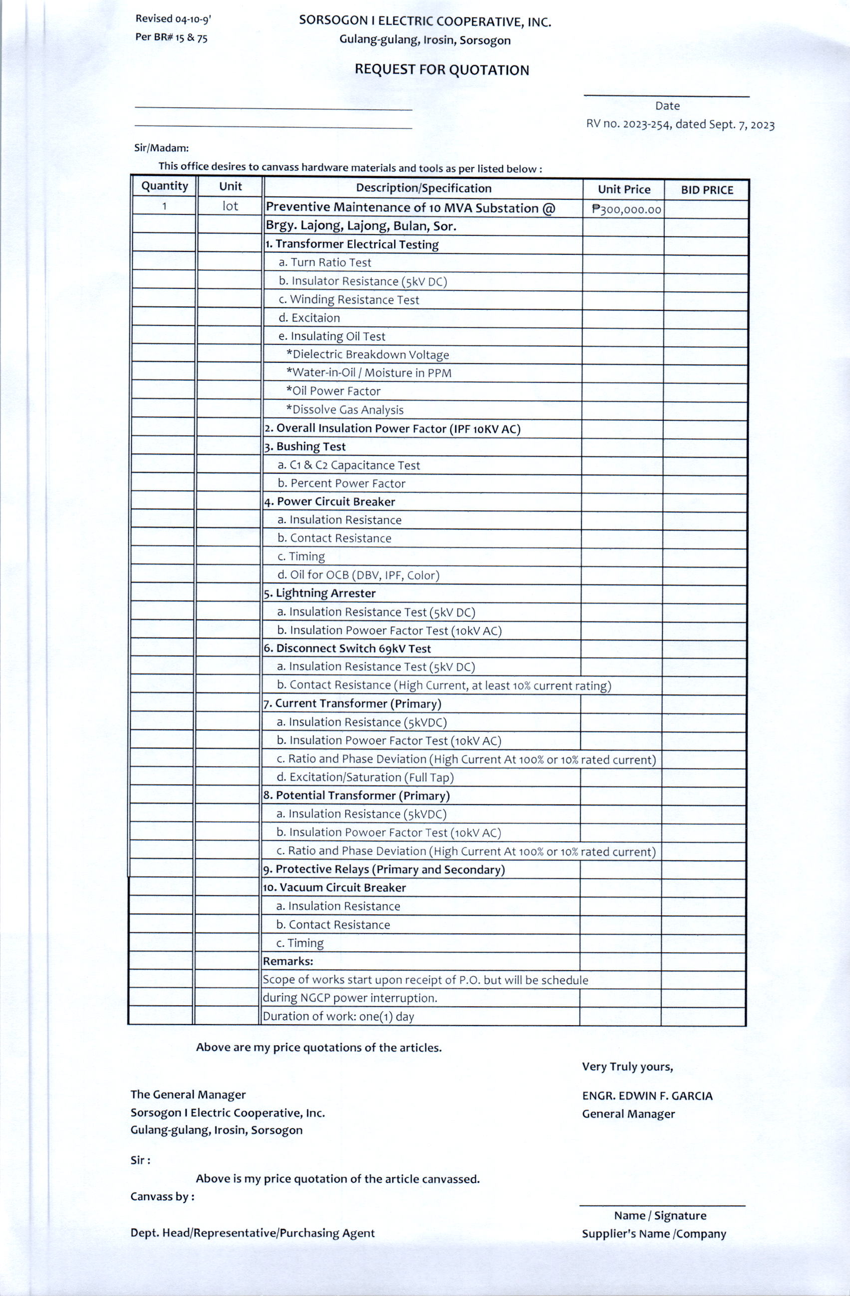 Date: September 20, 2023 To: Suppliers and Contractors Subject: Invitation to Bid (ITB) - Preventive Maintenance of Lajong sub Project ID: ITB-SEALED-CANVAS-Preventive-Maintenance-of-Lajong-sub Dear Sir/Madam, We invite you to participate in our Sealed Canvass for the Preventive Maintenance of Lajong Substation. Your expertise is essential in ensuring a reliable power supply.