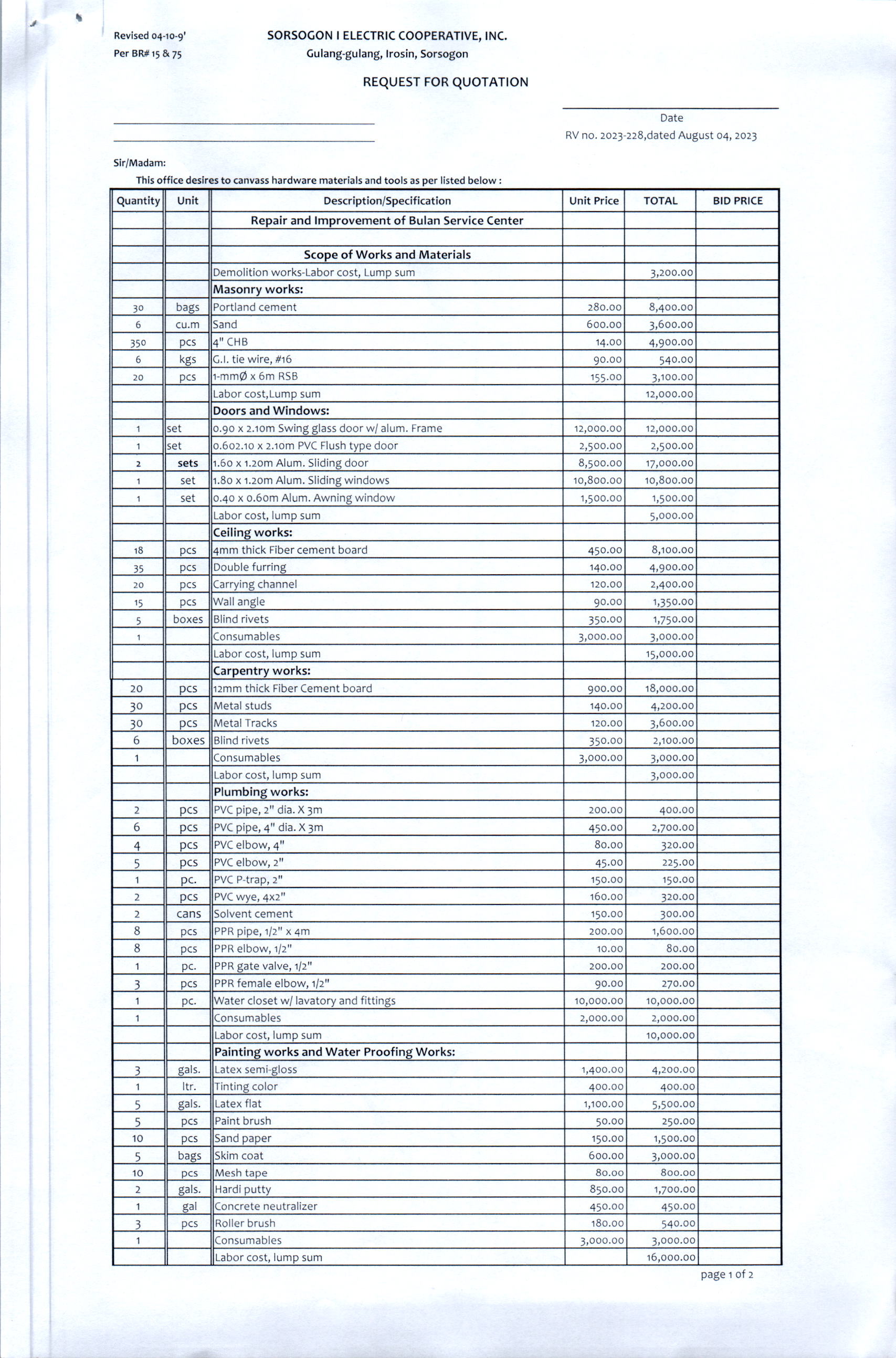 Date: September 20, 2023 To: Suppliers and Contractors Subject: Invitation to Bid (ITB) - Repair and improvement of Bulan Service center Project ID: ITB-SEALED-CANVASS-Repair-and-improvement-of-Bulan-Service-center Dear Sir/Madam, We invite you to participate in our Sealed Canvass for the Repair and improvement of Bulan Service center. Your expertise is essential in ensuring a reliable power supply.