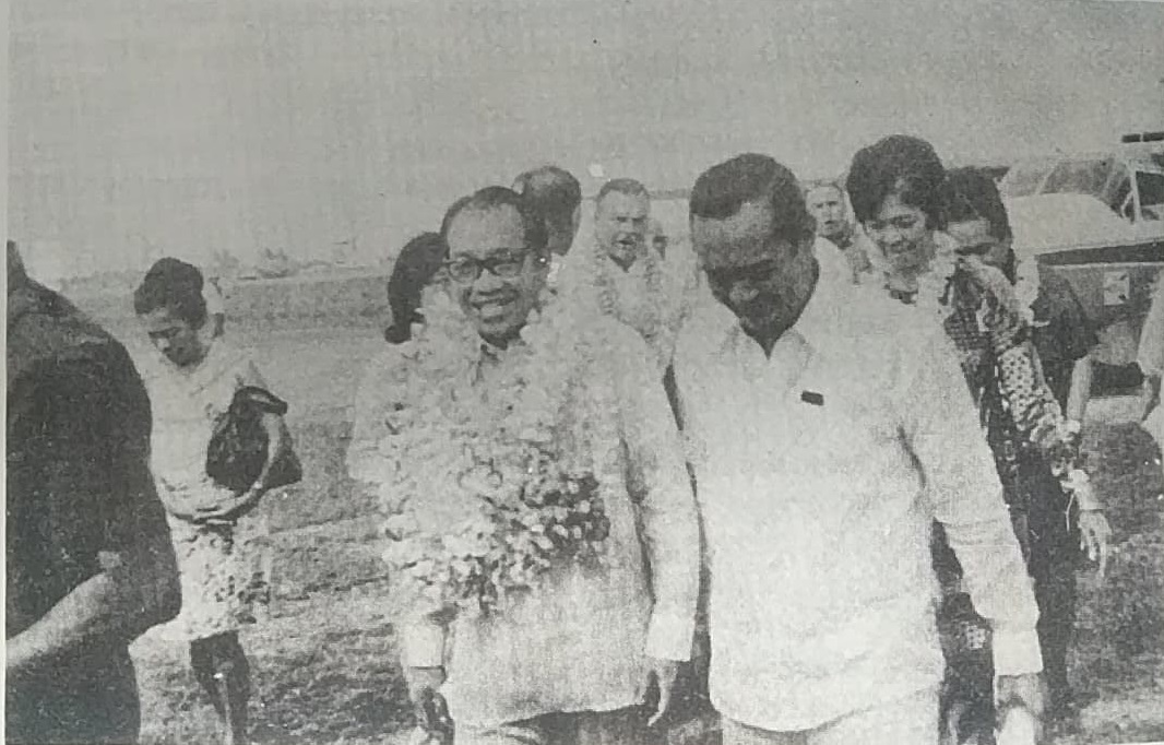 Photo shows arriving NEA visitors welcomers at the Bulan airport hours before the loan signing agreement. Left to right: Gen. Ceferino S. Carreon, NEA senior board memeber; Sorsogon Gov. Juan G. Frivaldo (back of camera); Engr. Hubert Bush, NEA consultant; Engr Admirado G, Luzuriaga, SORECO President and MS, Mary Joaquin, NEA PRO.