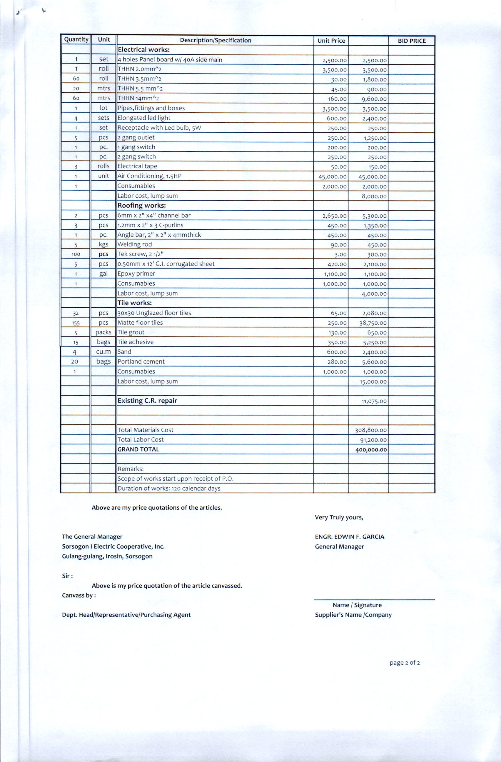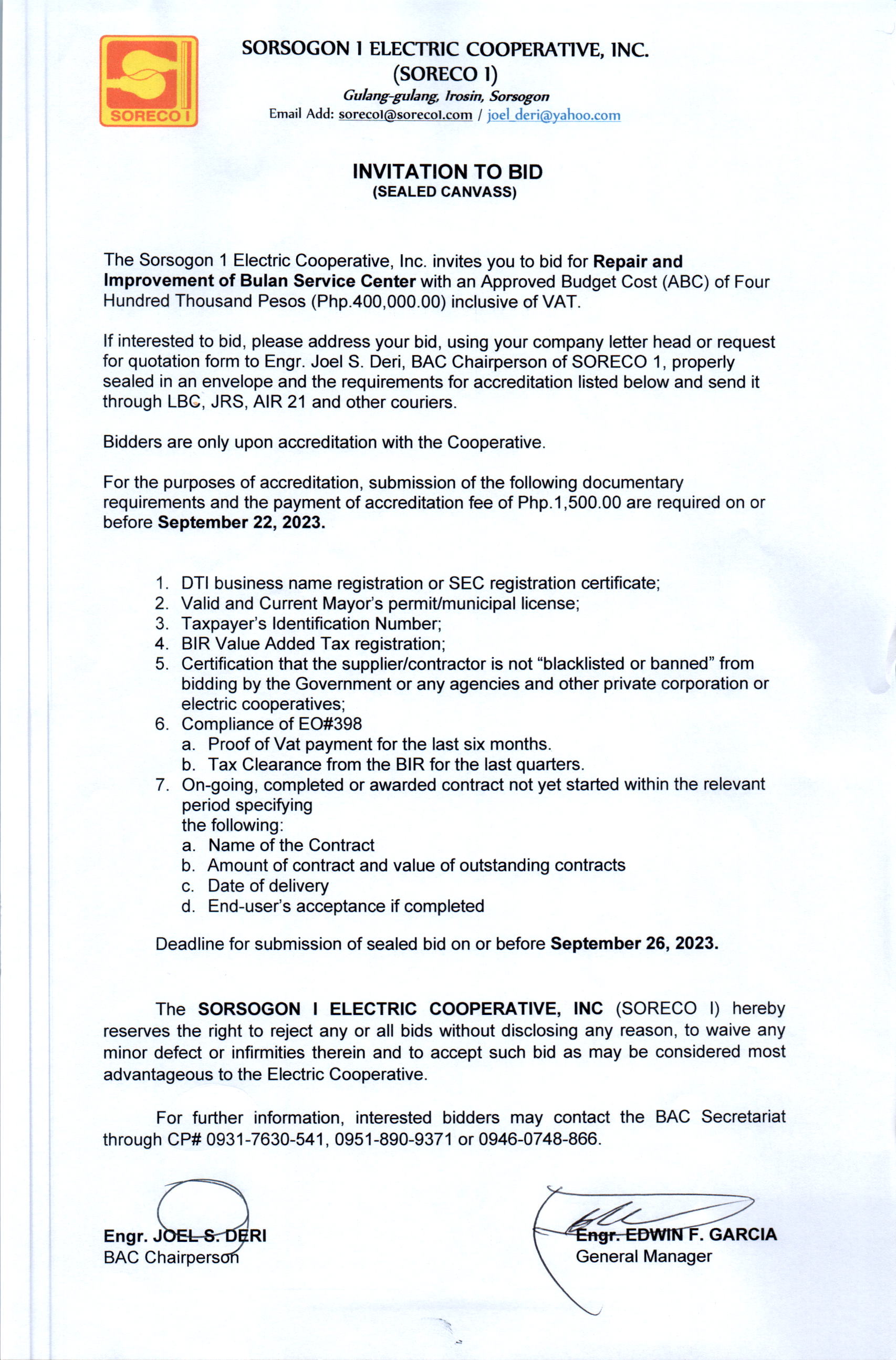 Date: September 20, 2023 To: Suppliers and Contractors Subject: Invitation to Bid (ITB) - Repair and improvement of Bulan Service center Project ID: ITB-SEALED-CANVASS-Repair-and-improvement-of-Bulan-Service-center Dear Sir/Madam, We invite you to participate in our Sealed Canvass for the Repair and improvement of Bulan Service center. Your expertise is essential in ensuring a reliable power supply.